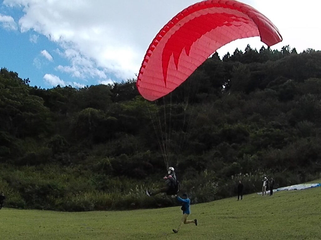 晴れていれば、海の見える山頂からタンデム飛行で30mの上空を空中散歩できたのにと思うと残念ですが、浮遊体験でも浮き上がる時の気持ち良さは最高で、充分に楽しめました。