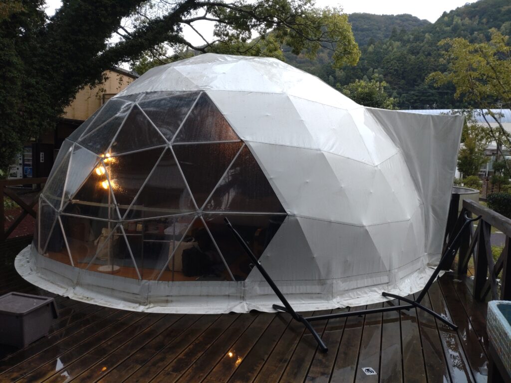夕方には別行動の社員と月ヶ瀬に合流し、今はやりのドームテントでグランピング。