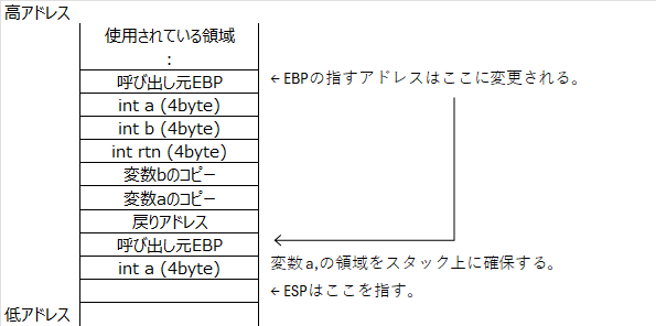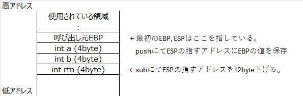 続いてスタック上に a, b, rtn の3個の変数領域(合計12バイト)を確保する。