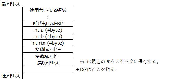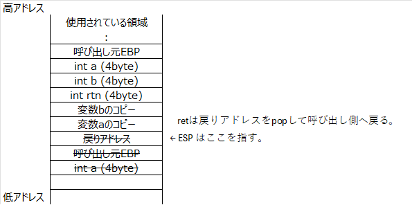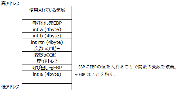 これにより、関数内で確保したローカル変数領域は破棄される。