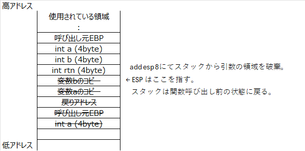 push した引数2個分(8バイト)を破棄し、スタックポインタを元の位置へ戻す。